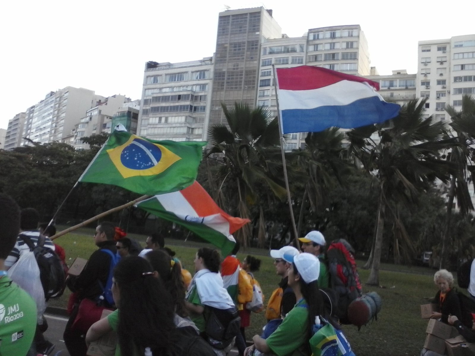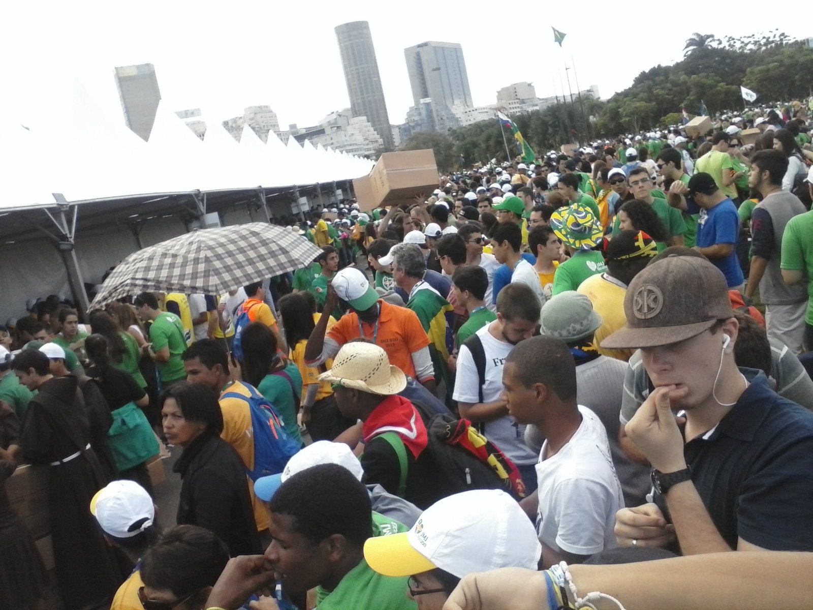 Durante o percurso até Copacabana paramos em um ponto de distribuição dos kits alimentação, demoramos cerca de 4 horas na fila para pega-los. O momento mais delicado era na hora de utilizar os banheiros químicos. Era preciso ficar ao menos 1 hora na fila pra utiliza-los ou pagar cinco reais para utilizar banheiro dos comércios que mesmo assim, possuíam filas. Isso se deu por conta das mudanças de ultima hora que houve na programação da Jornada, já que devido à chuva, os eventos que iriam acontecer em Guaratiba (que já havia uma infraestrutura melhor organizada) foram realocados para Copacabana e por isso não houve tempo para transportar todos os banheiros para lá. O que me chamou a atenção foi um evento que reuniu quase quatro milhões de pessoas e mesmo assim não aconteceu NENHUM tipo de briga ou violência em pleno Rio de Janeiro.