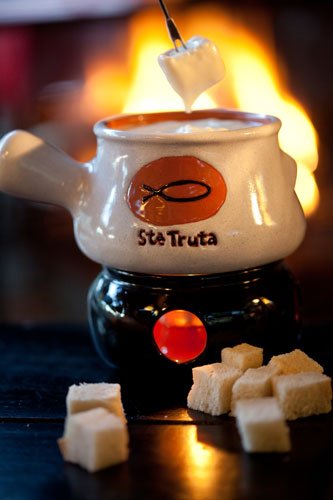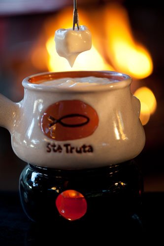 Para servir uma boa fondue, é preciso ajustar a chama do réchaud a fim de manter a temperatura da massa no estado ideal. Depois é só espetar um cubinho de pão com garfo apropriado e bom apetite!